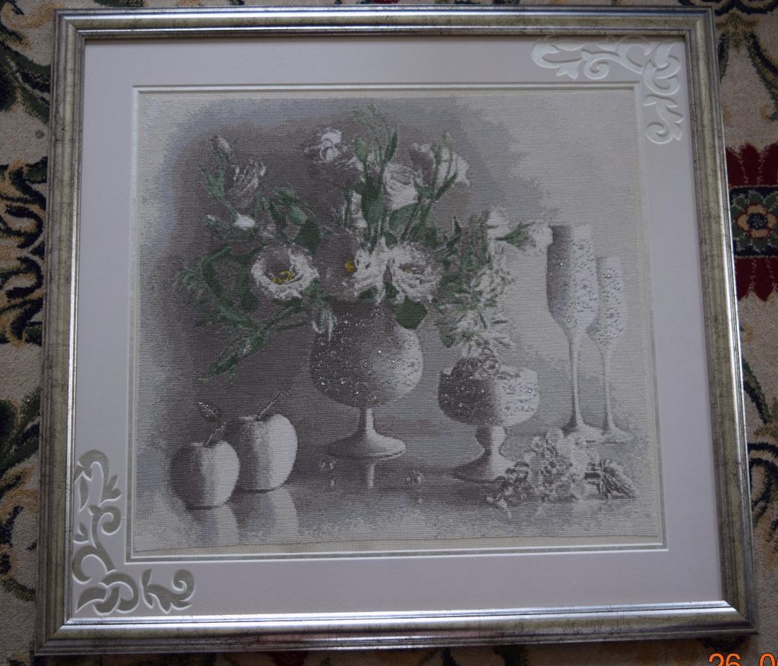 Районная библиотека проводила конкурс рукоделия "Нежных рук мастерство" к 8 марта. Что-то я решила вдруг поучаствовать, для этого еле дотащила туда самую большую свою вышивку "Белый натюрморт" (видимо, полагая, что чем больше, тем лучше, хотя по дороге ругала себя, почему не взяла то, что помещается в сумочке...)