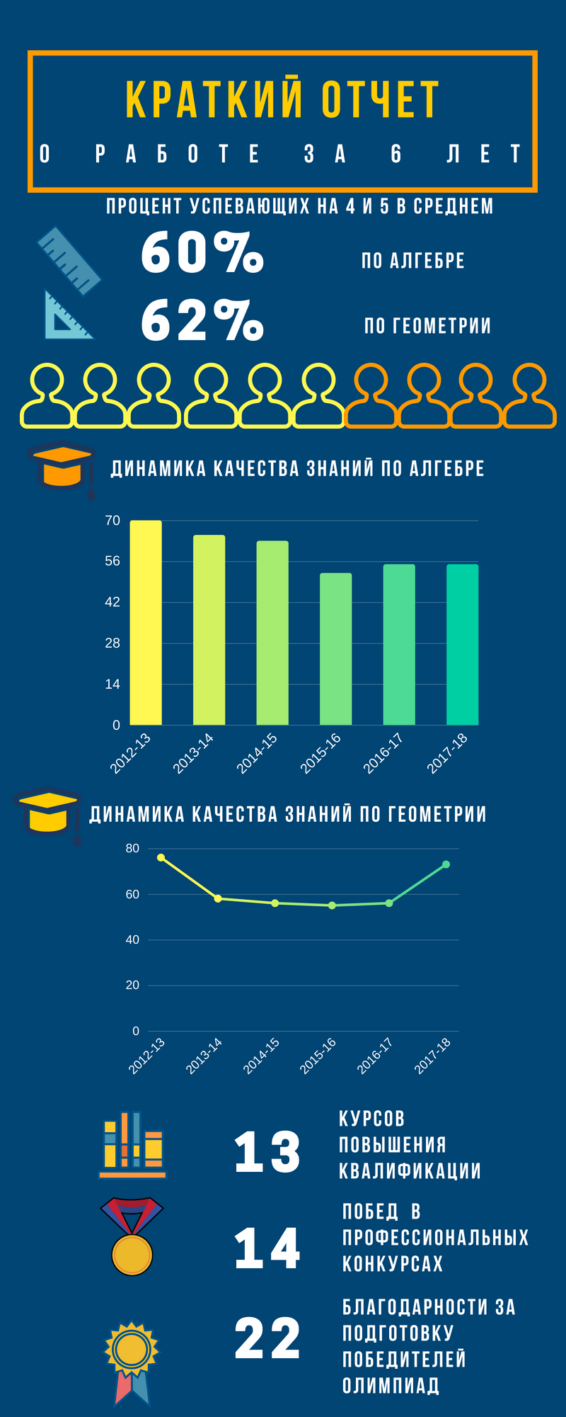 Шесть лет пролетело незаметно, я теперь учитель высшей категории; участвую в разных конкурсах, стараюсь привлечь и учеников к олимпиадному движению, занимаюсь с учениками в театральной студии класса, и все время учусь. Учусь каждый день, вспоминая слова Станиславского: «Каждый день, в который вы не пополнили своего образования хотя бы маленьким, но новым для вас куском знания, считайте бесплодно и невозвратно для себя погибшим»