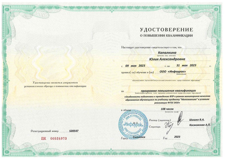 "Особенности подготовки к проведению ВПР в рамках мониторинга качества образования обучающихся по учебному предмету "Математика" в условиях реализации ФГОС ООО", 108 часов, ООО "Инфоурок",г.Смоленск