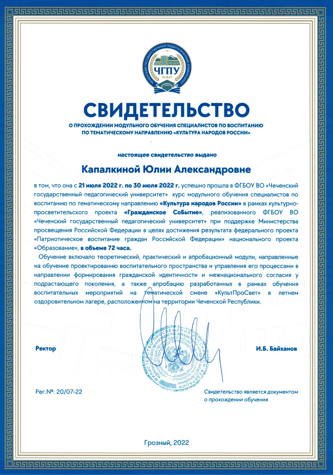 Курс модульного обучения специалистов в области воспитания "Культура народов России" в рамках проекта "Гражданское соБытие", 72 часа, Чеченский государственный педагогический университет