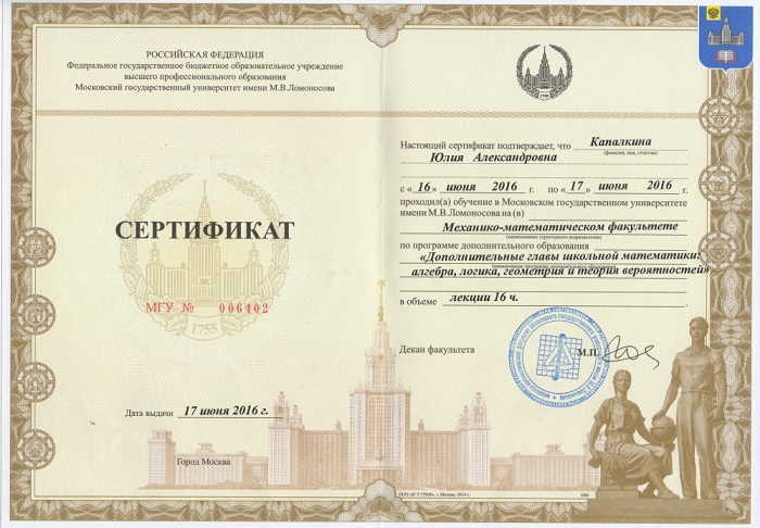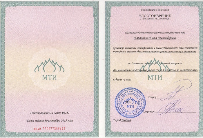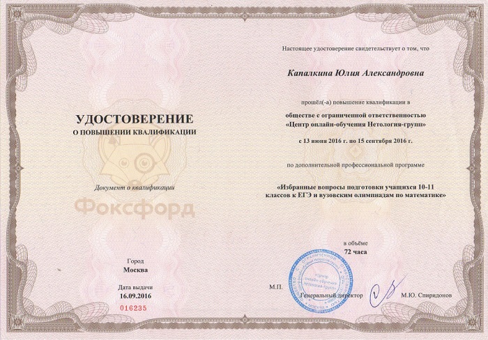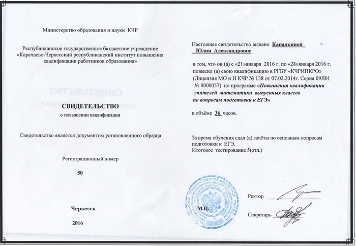 Повышение квалификации учителей математики выпускных классов по вопросам подготовки к ЕГЭ (36 часов).