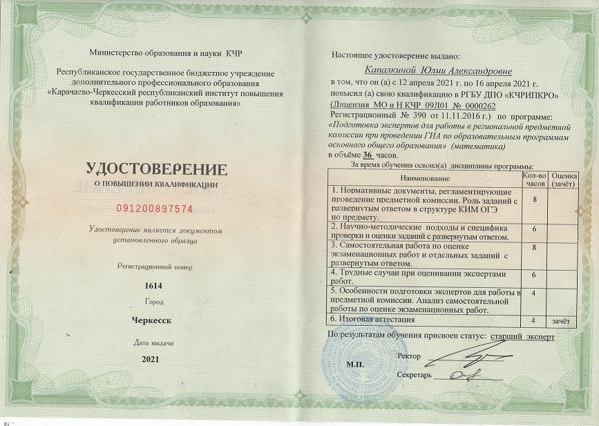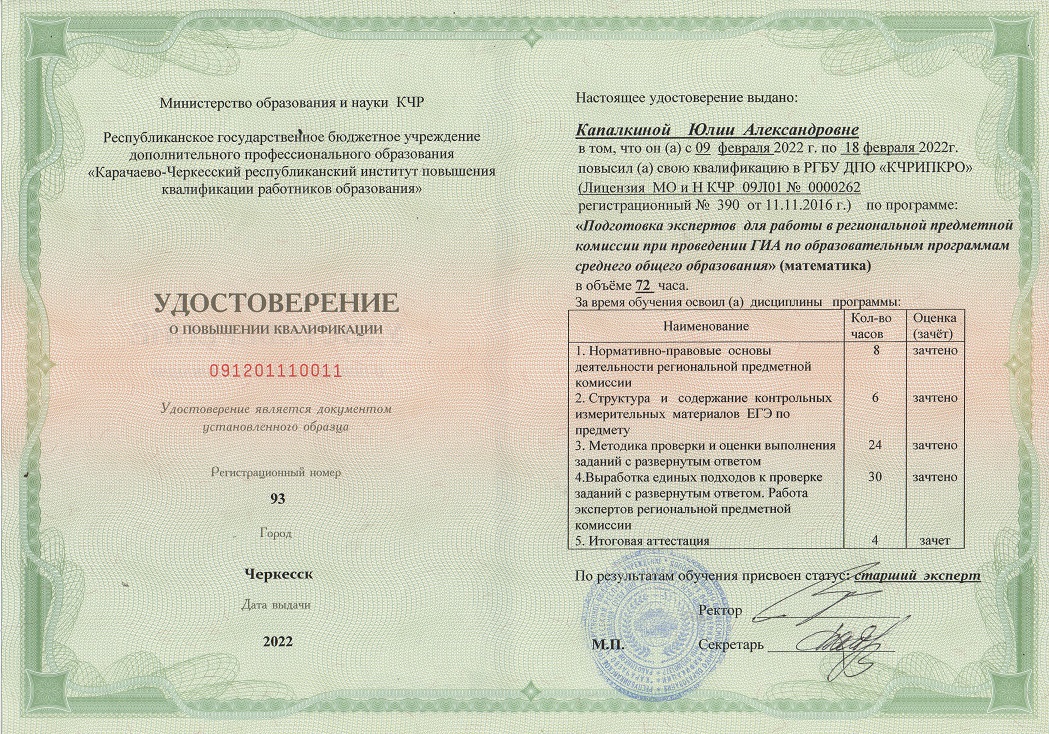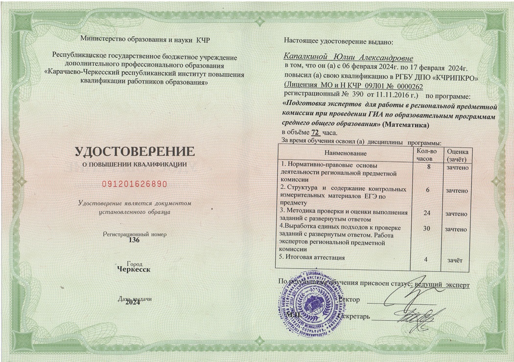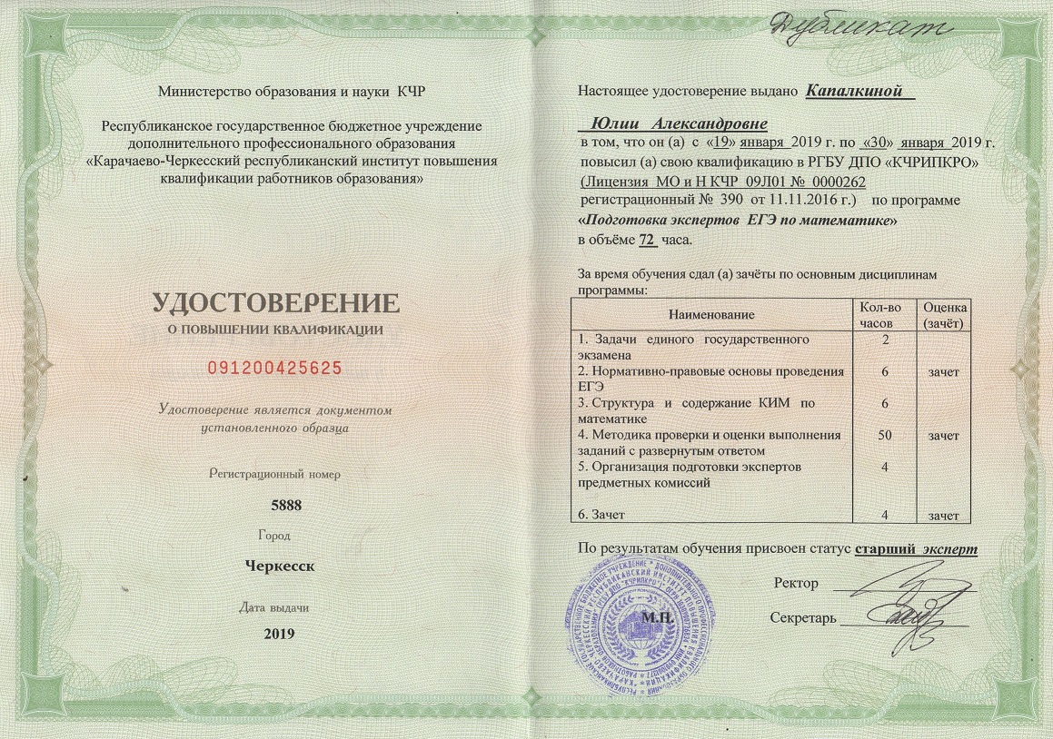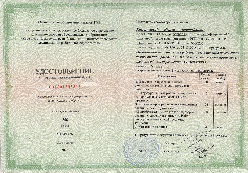 Подготовка экспертов для работы в региональной предметной комиссии при проведении ГИА по образовательным программам среднего общего образования (математика) , 72 часа, РГБУ ДПО КЧРИПКРО, статус - ведущий эксперт