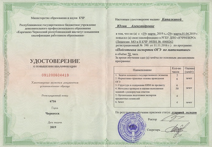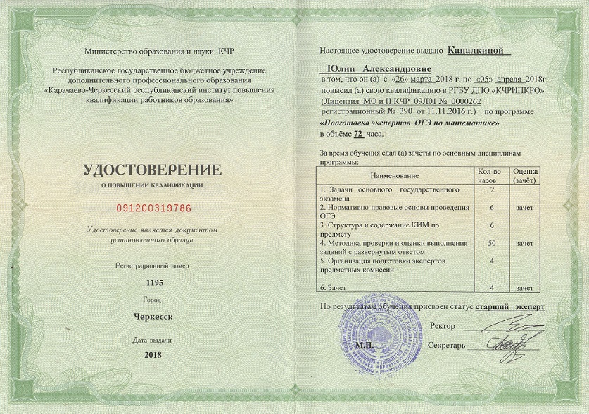 Подготовка экспертов ОГЭ по математике (72 часа). РГБУ ДПО КЧРИПКРО, г. Черкесск