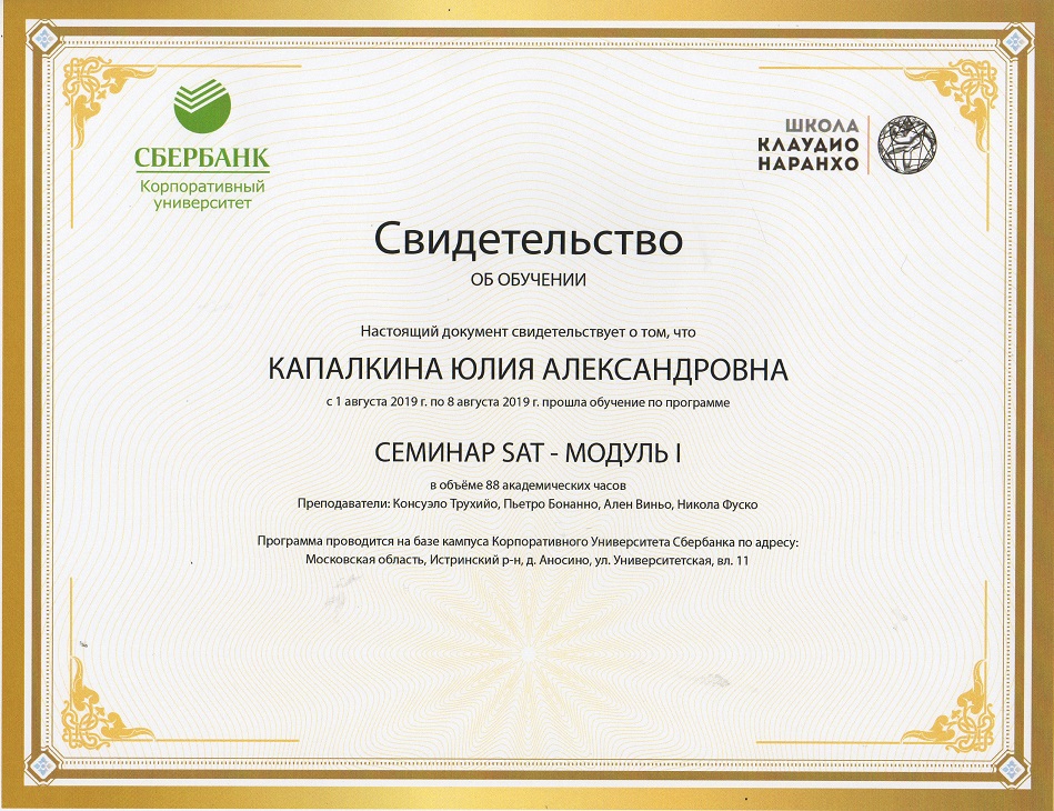 Развитие эмоционального интеллекта в рамках программы "SAT-1" (88 часов). Корпоративный университет Сбербанка, г.Москва, Школа Клаудио Наранхо.