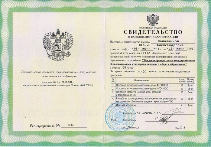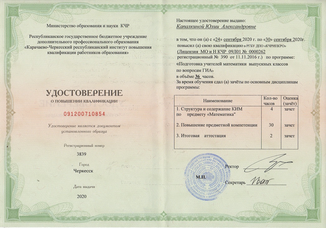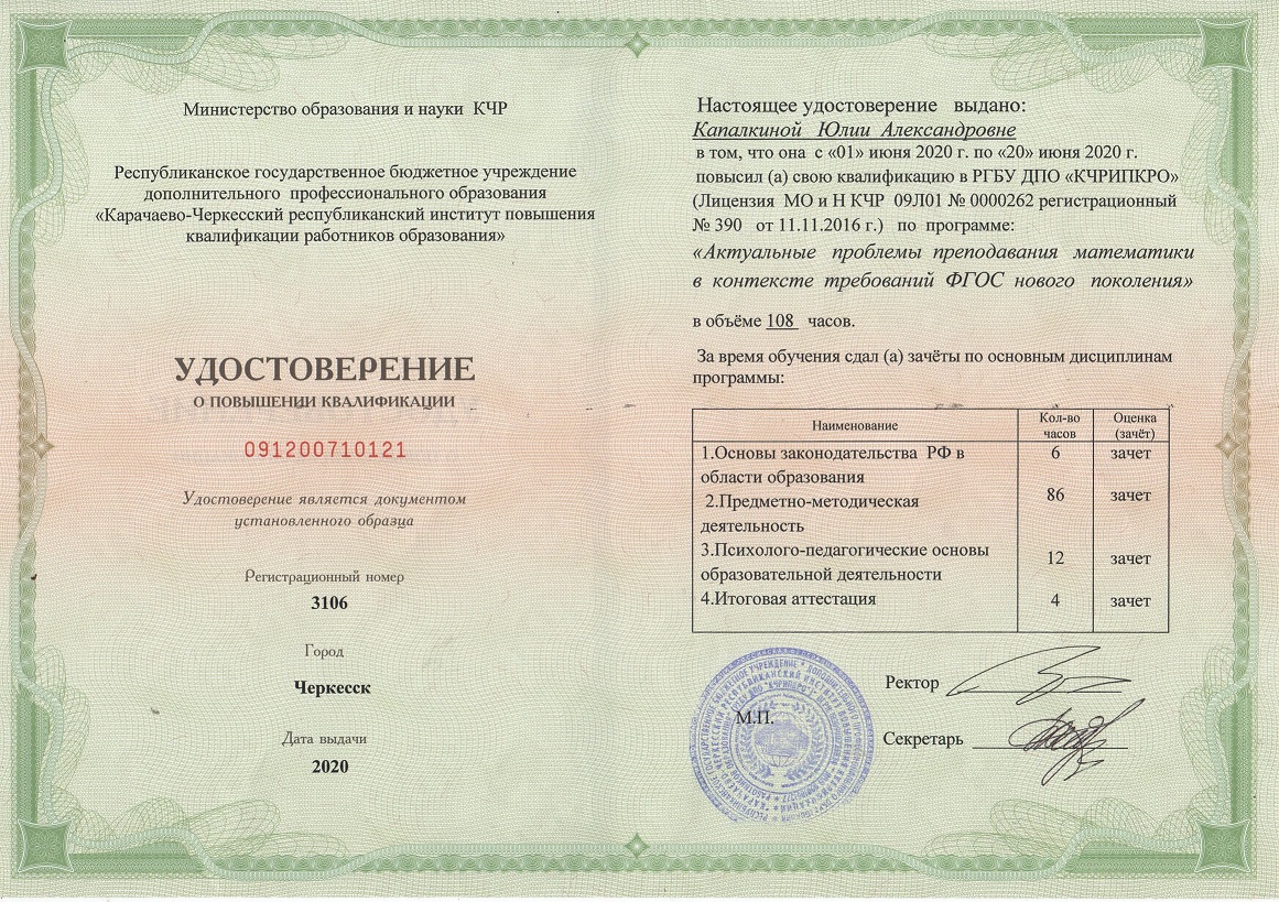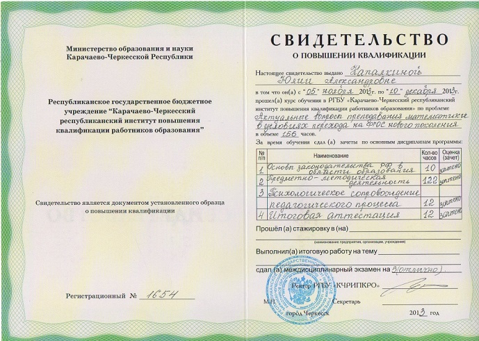 Актуальные аспекты преподавания математики в контексте требований ФГОС нового поколения. Черкесск, РГБУ ДПО КЧРИПКРО (108 часов)