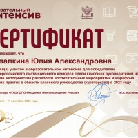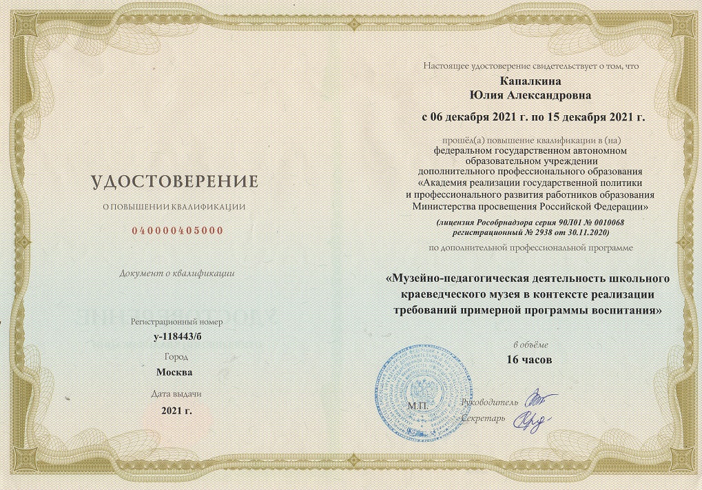 "Музейно-педагогическая деятельность школьного краеведческого музея в контексте реализации требований примерной программы воспитания", г. Москва, ФГАОУ ДПО "АРГПиПРРО Министерства просвещения РФ", 16 часов.