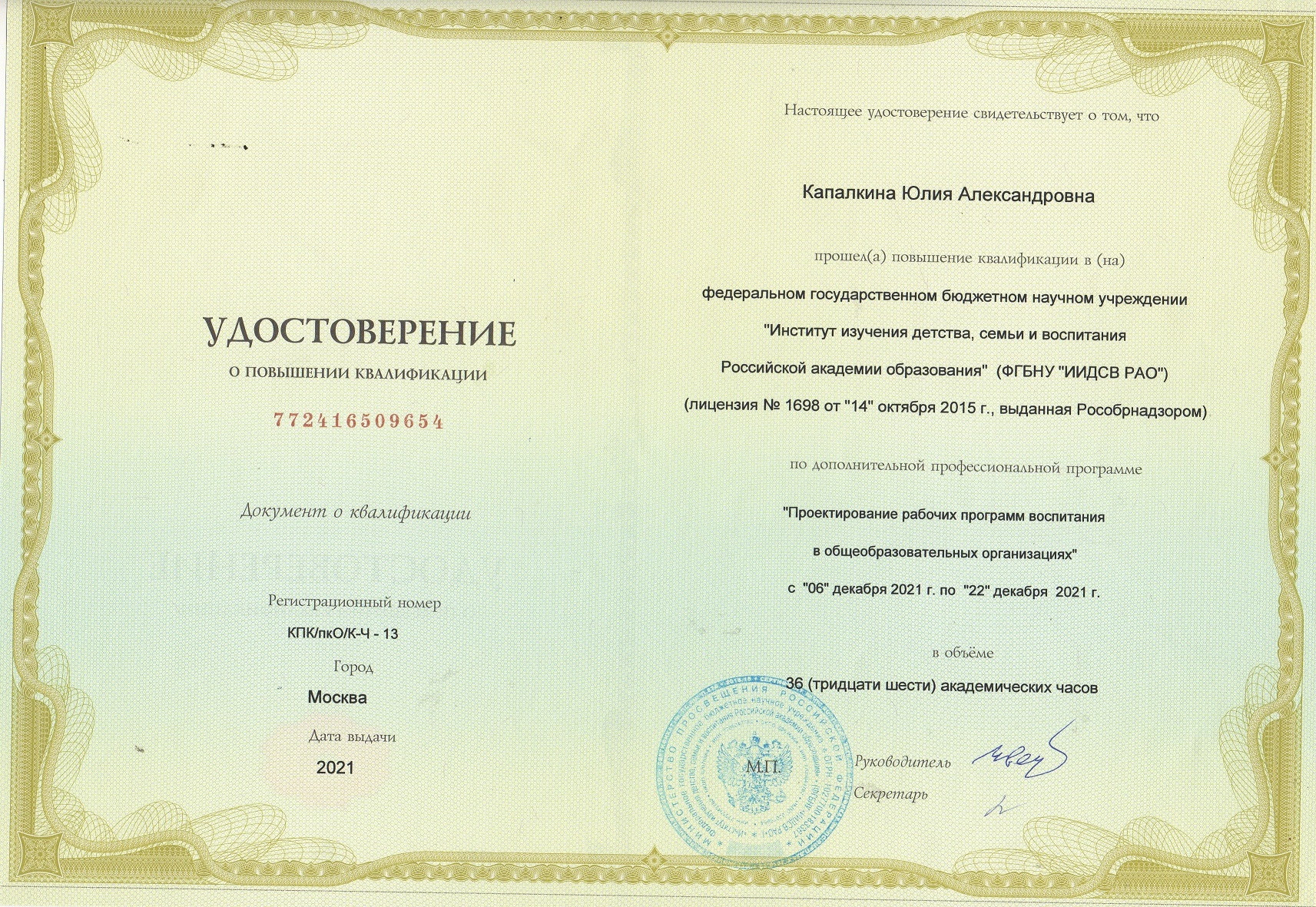 Проектирование рабочих программ воспитания в общеобразовательных организациях (36 часов), ФГБНУ "ИИДСВ РАО"