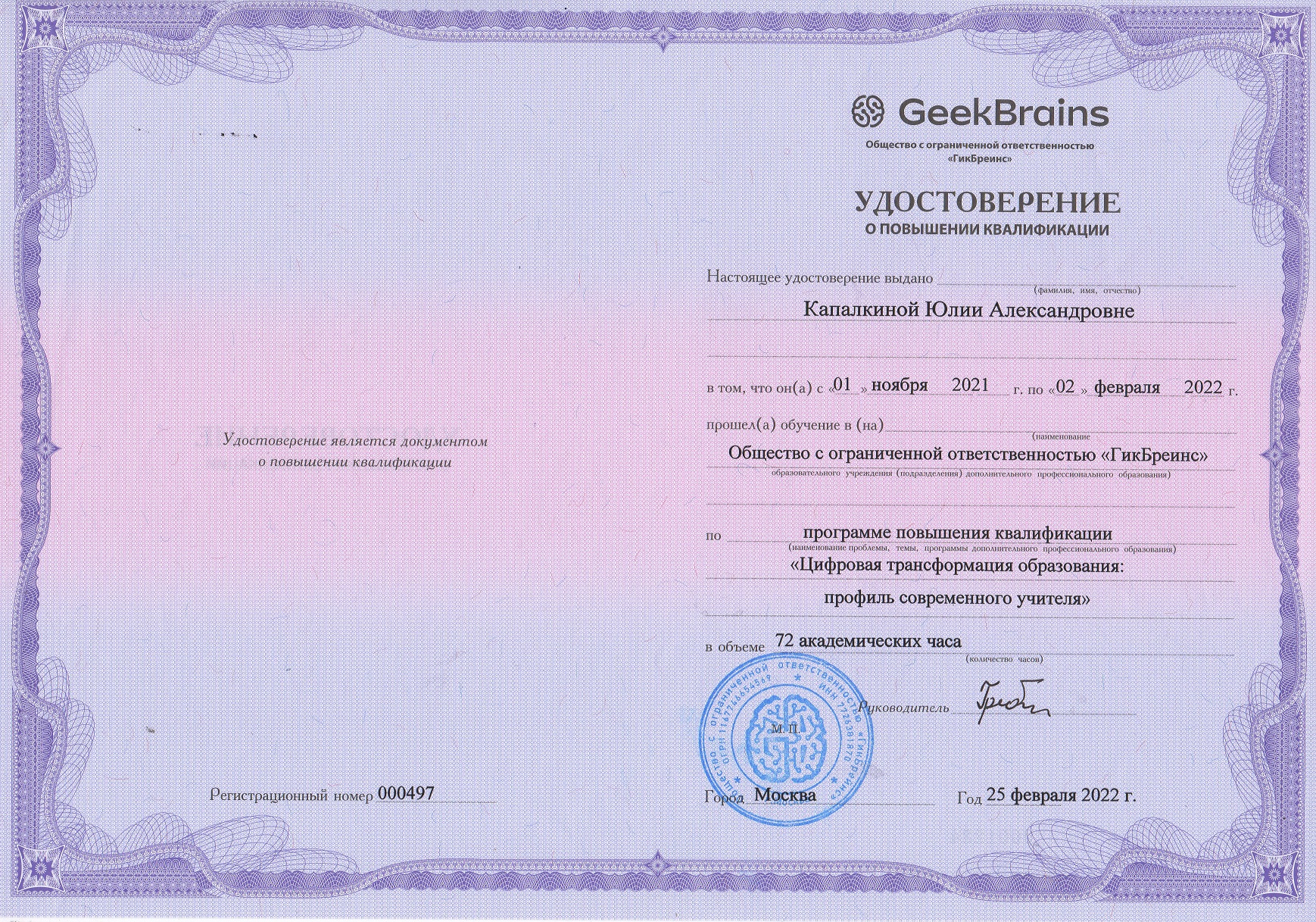 Цифровая трансформация образования: профиль современного учителя. (72часа), Москва, ООО "ГикБрейнс"