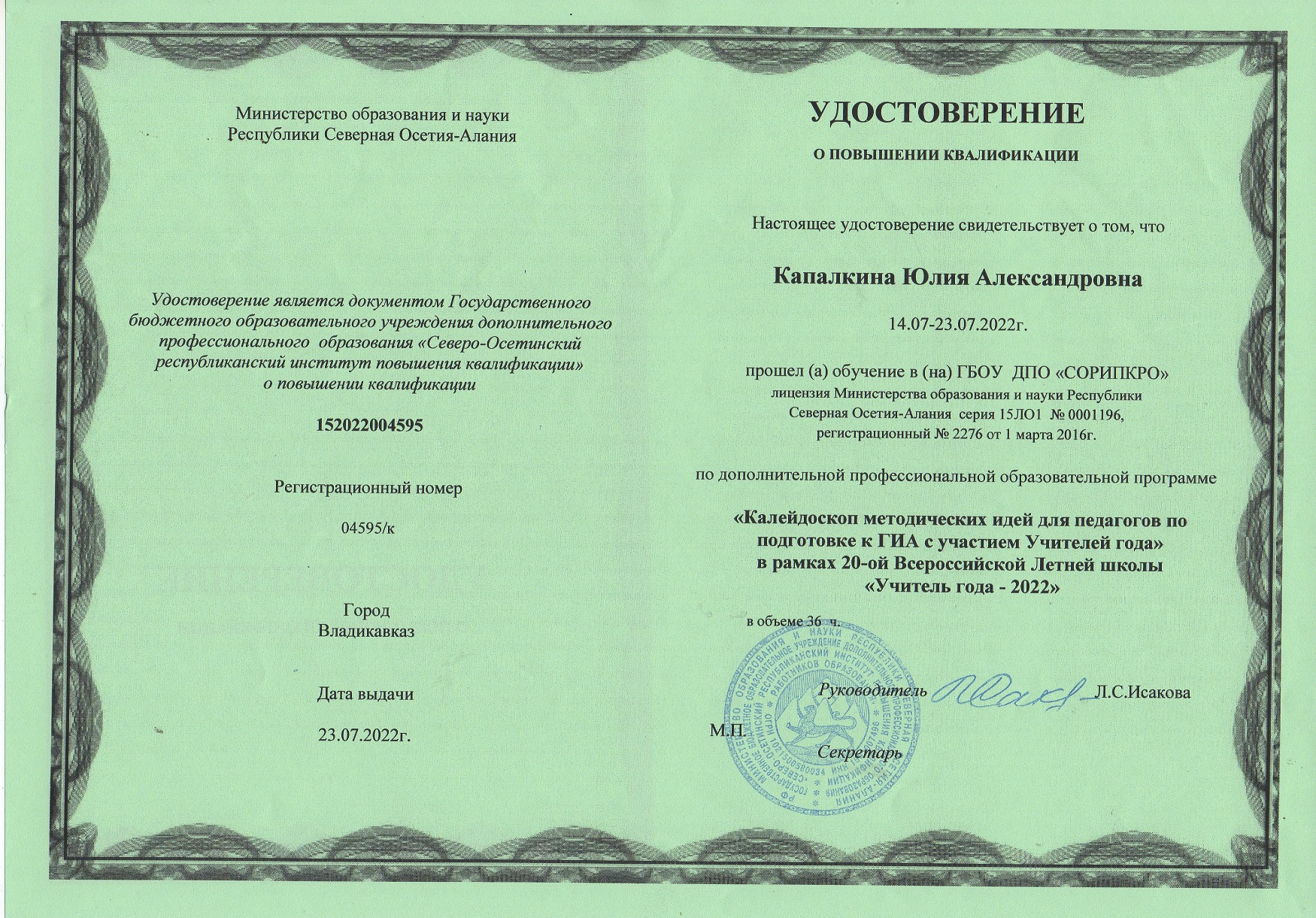 "Калейдоскоп методических идей для педагогов по подготовке к ГИА с участием Учителей года" в рамках 20-й Всероссийской Летней школы "Учитель года - 2022", ГБОУ ДПО "Северо-Осетинский республиканский институт повышения квалификации", 36 часов