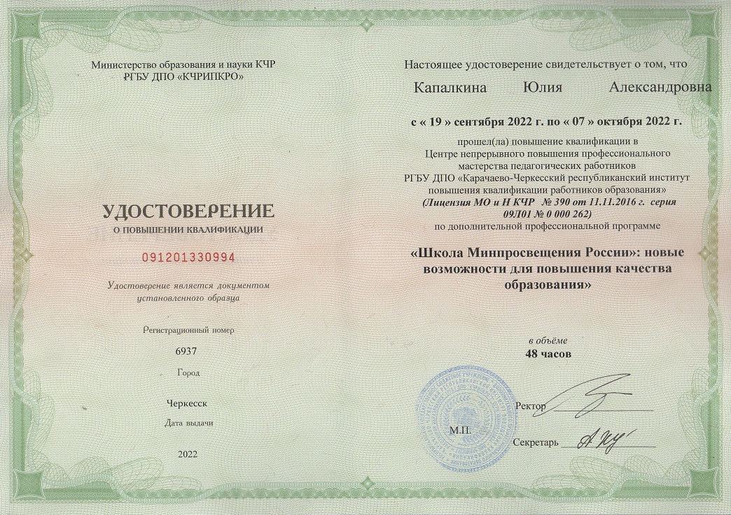 "Школа Минпросвещения России: новые возможности для повышения качества образования", Черкесск, РГБУ ДПО КЧРИПКРО, 48 часов
