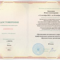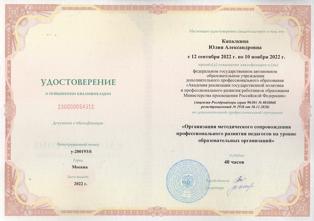 "Организация методического сопровождения профессионального развития педагогов на уровне образовательных организаций", Москва, Академия Минпросвещения, 40 часов