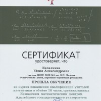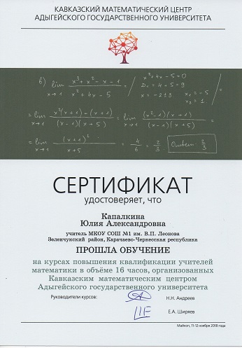 Курсы учителей математики опорных школ КМЦ АГУ(16 часов), Кавказский математический центр Адыгейского государственного университета, г.Майкоп.