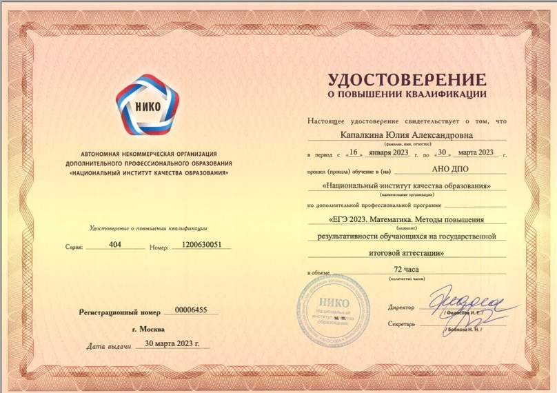 "ЕГЭ 2023. Математика. Методы повышения результативности обучающихся на государственной итоговой аттестации", 72 часа, АНО ДПО "Национальный институт качества образования"