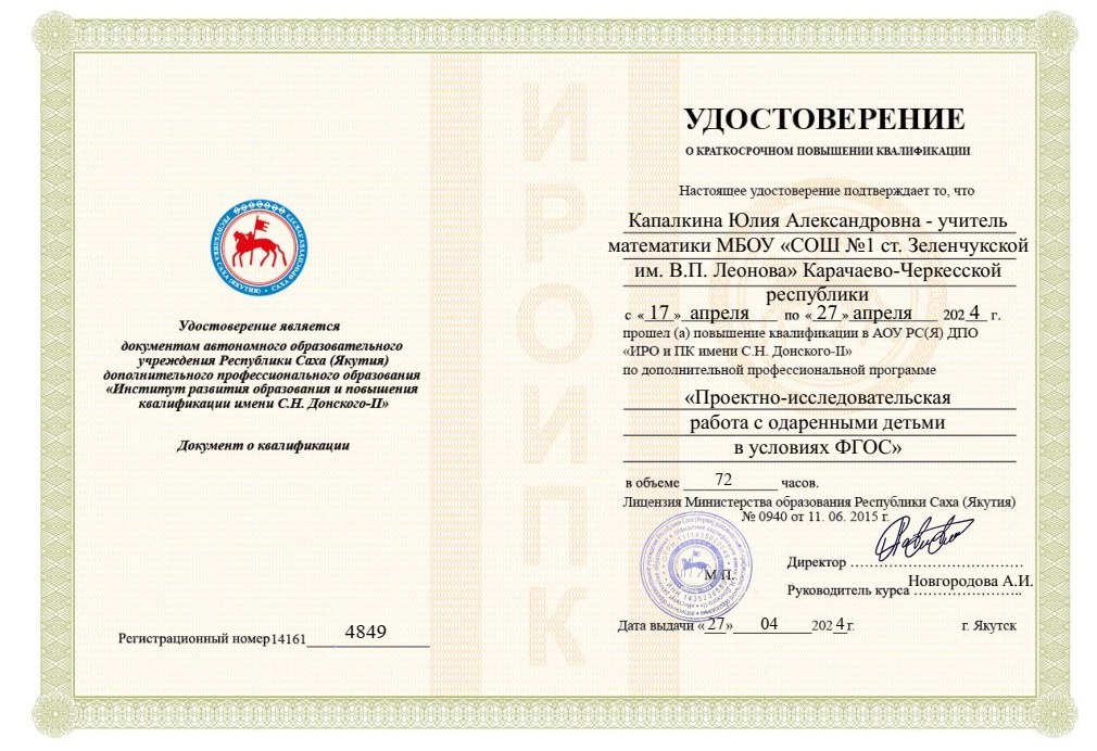 Проектно-исследовательская работа с одаренными детьми в условиях ФГОС, АОУ РС(Я) ДПО "ИРО и ПК имни С.Н.Донского-П", 72 часа