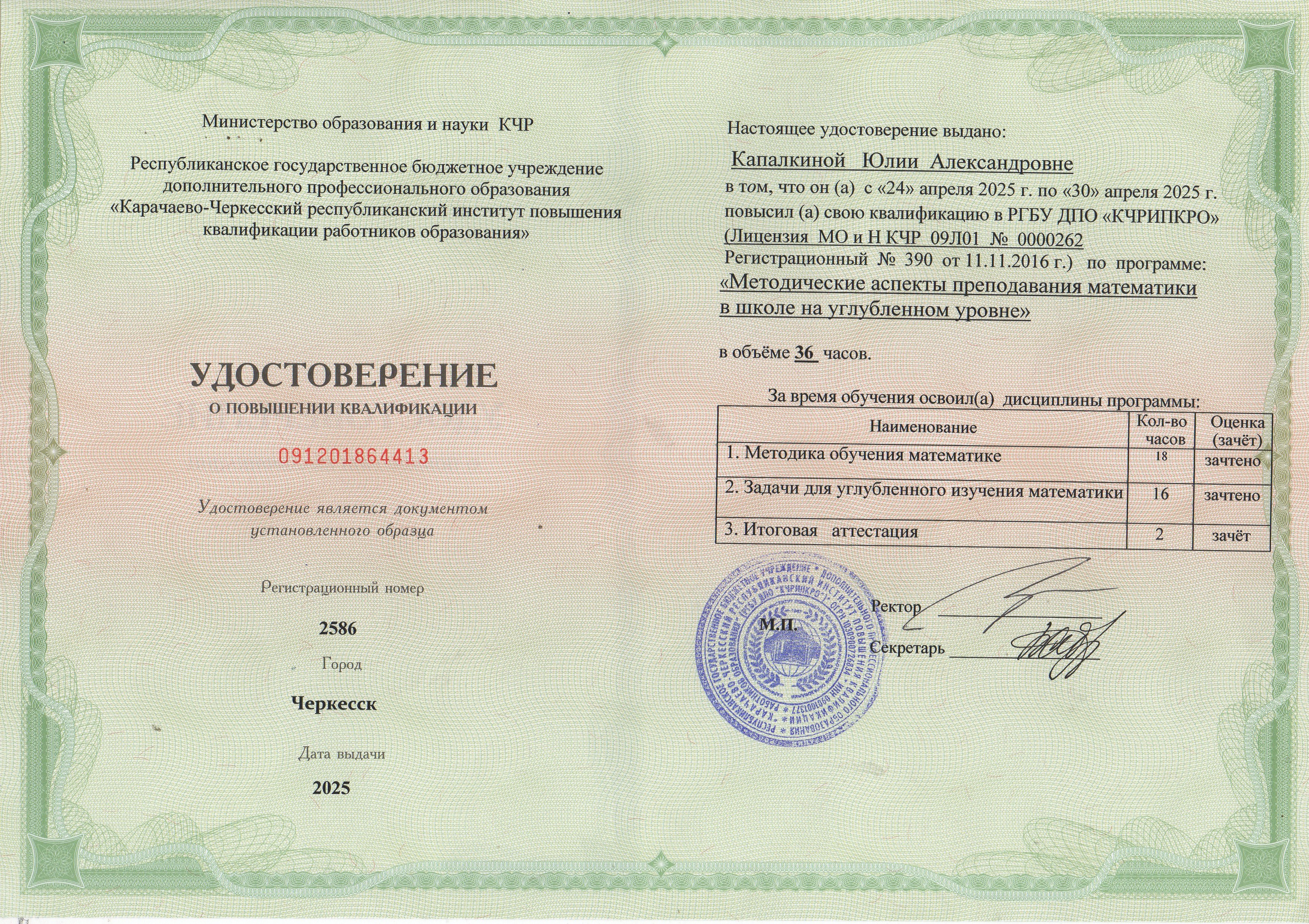 Методические аспекты преподавания математики в школе на углубленном уровне, РГБУ ДПО "КЧРИПКРО", 36 часов
