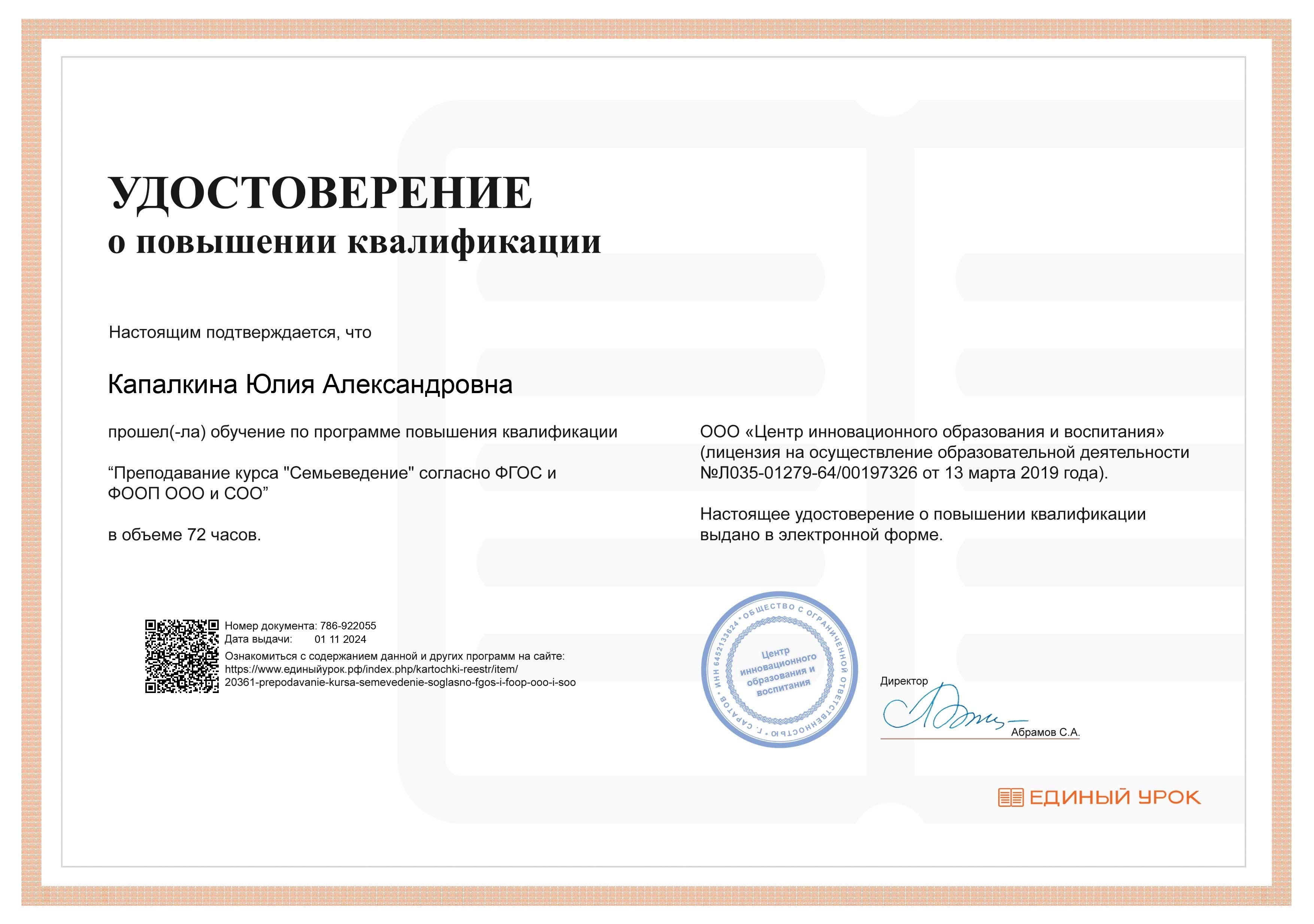 Преподавание курса "Семьеведение согласно ФГОС и ФООП ООО и СОО, Единый урок, 72 часа